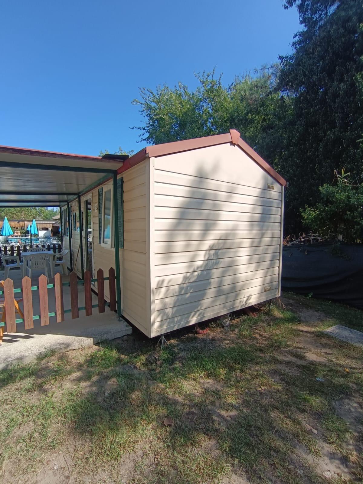 Chassis in acciaio zincato con ruote. Pavimento in materiale ligneo con linoleum in pvc. Struttura perimetrale composta da pannelli dogati coibentati. Infissi in alluminio. Tetto composto da lamiere ondulate finte tegole, capriate in legno e pannello coibentato.