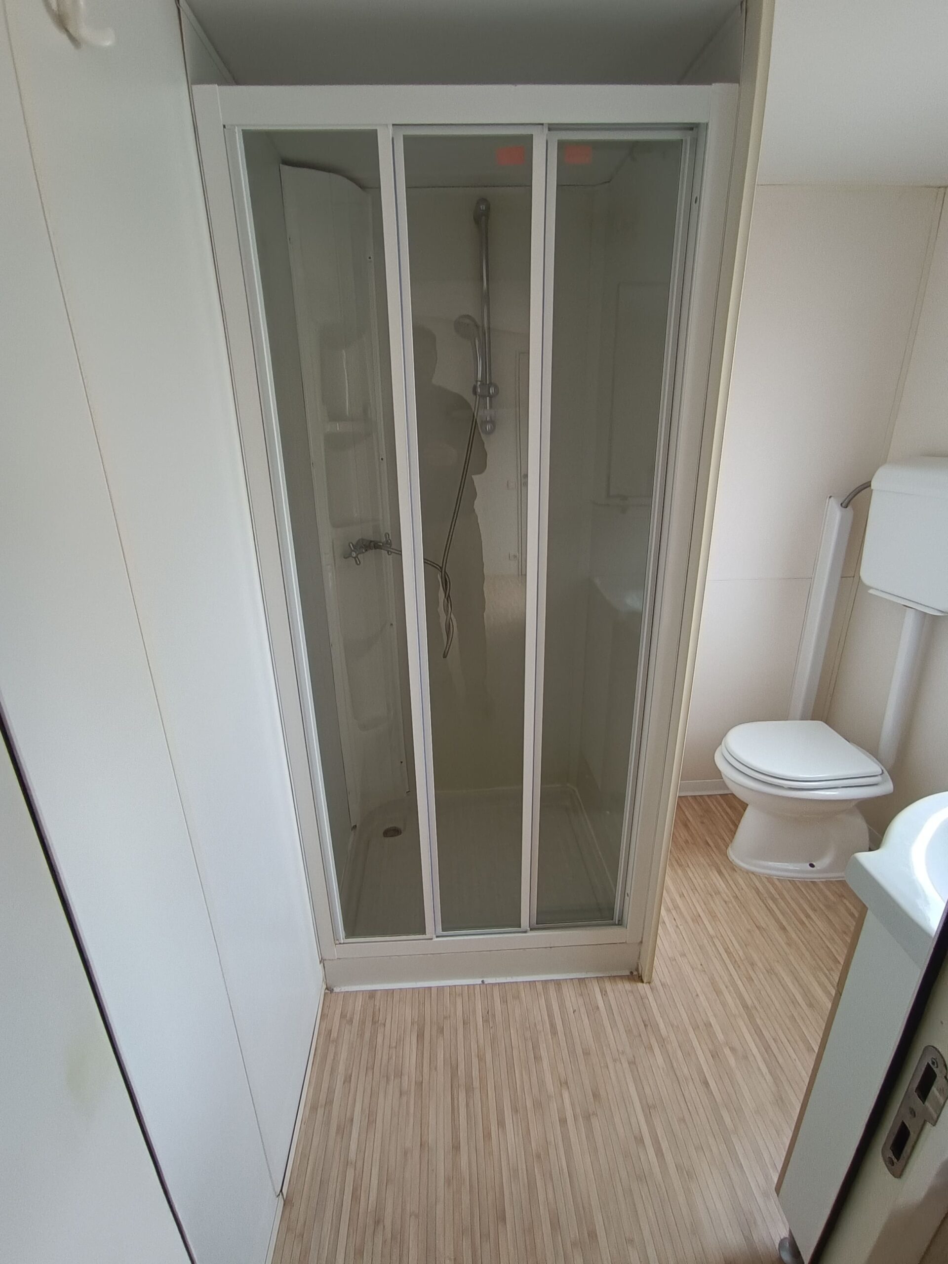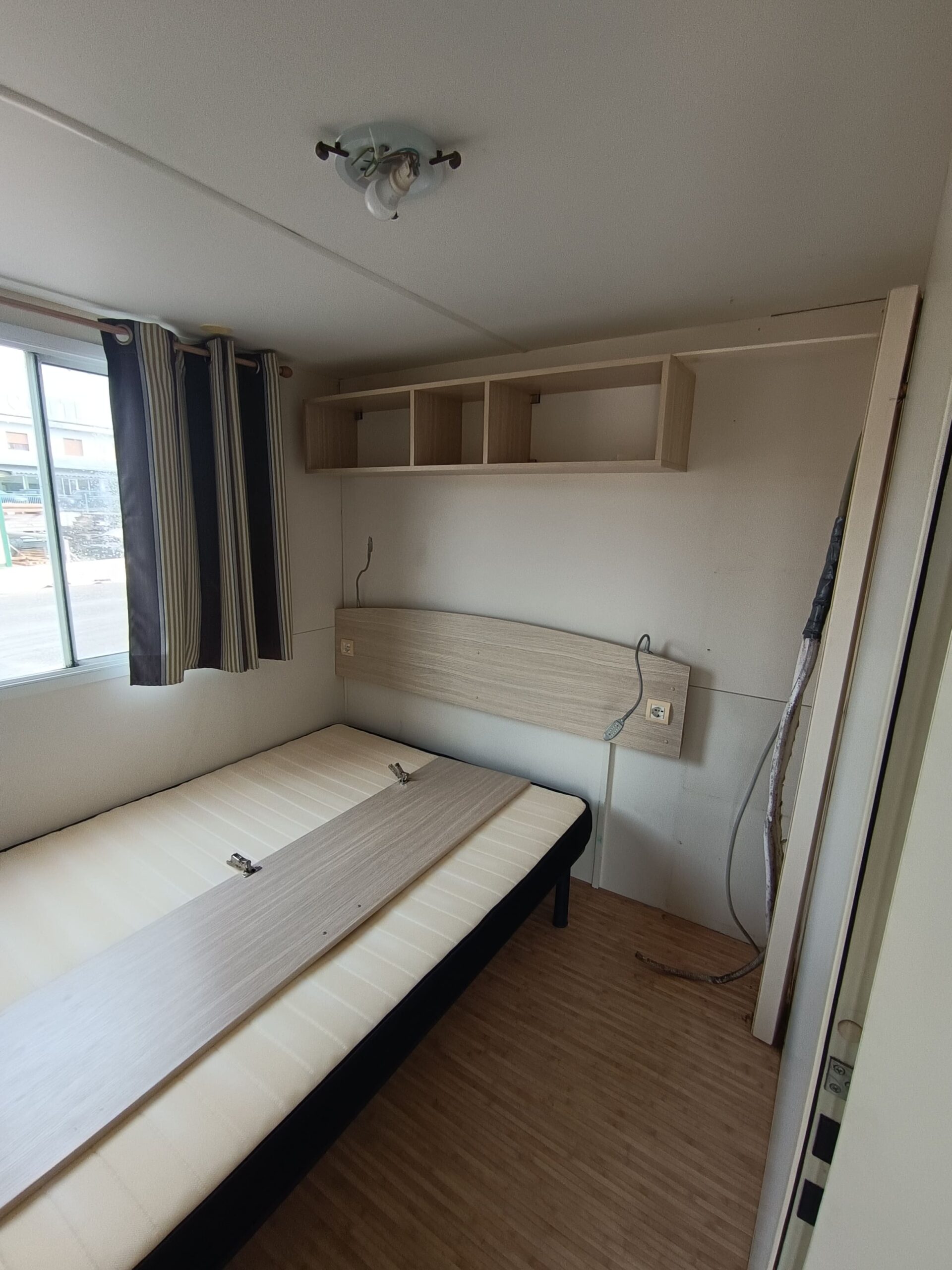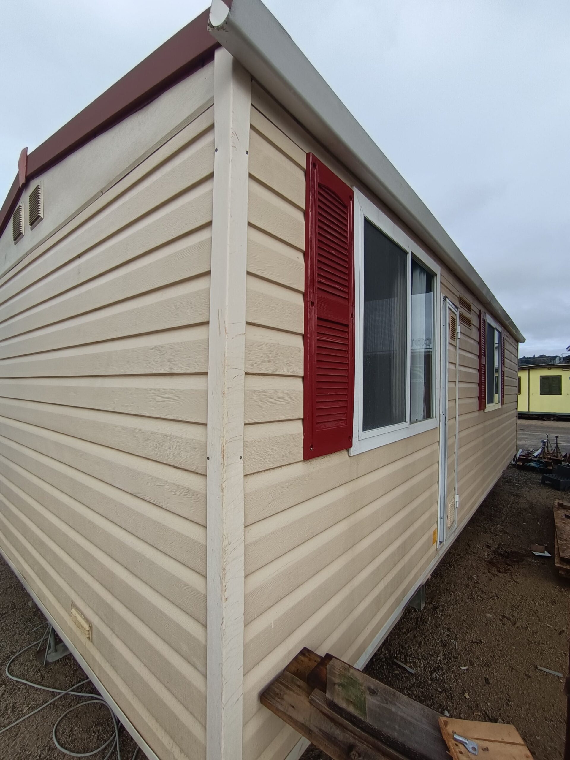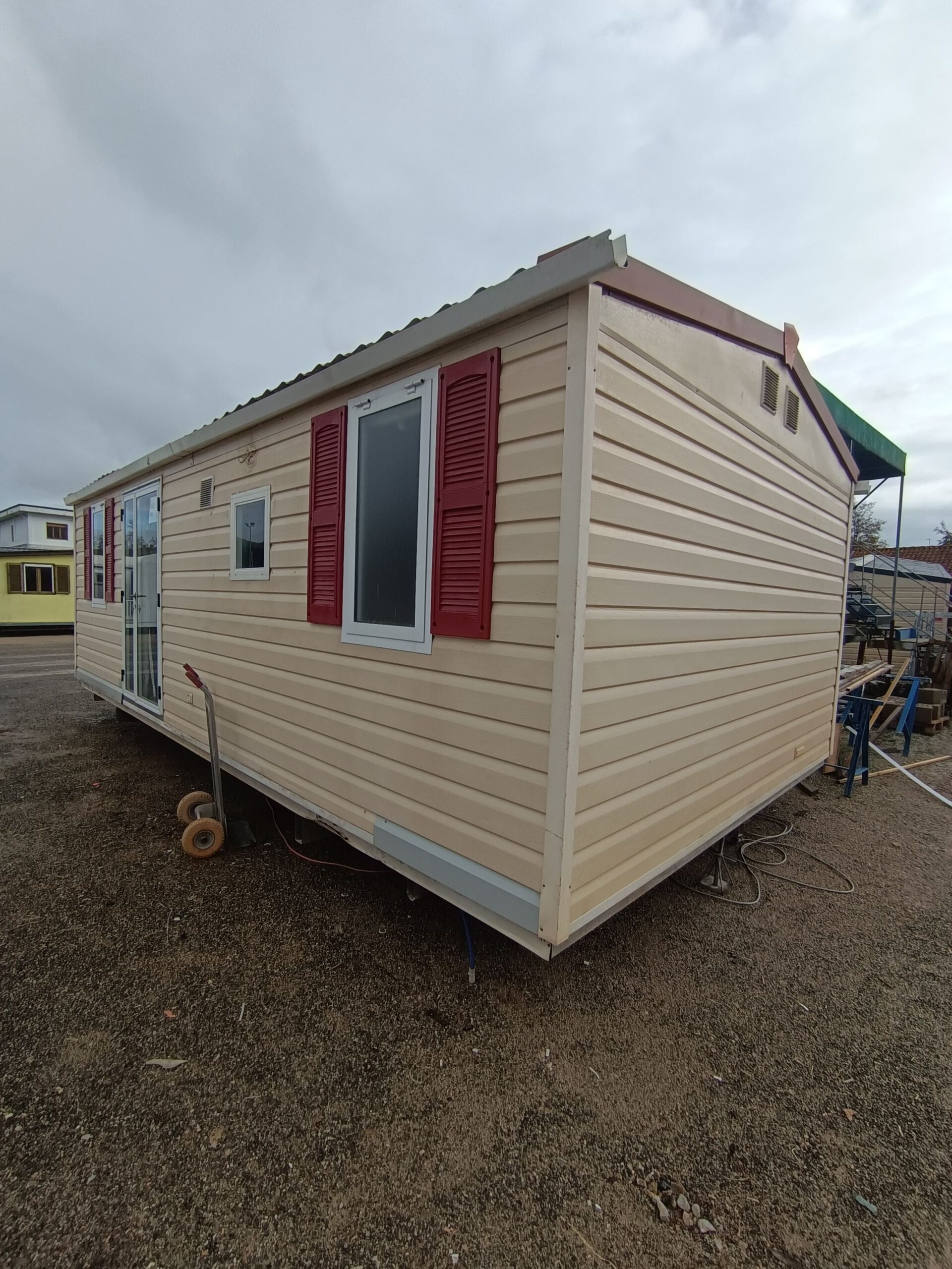 Pannelli coibentati perimetrali, infissi in alluminio, tetto con lamiere ondulate avvitate su capriate in legno con telo vapore e pannello controsoffitto, carrello in acciaio zincato con barre perimetrali cosciali assale con le ruote e omeghe su cui è avvitato il pavimento in materiale ligneo con linoleum finto legno.