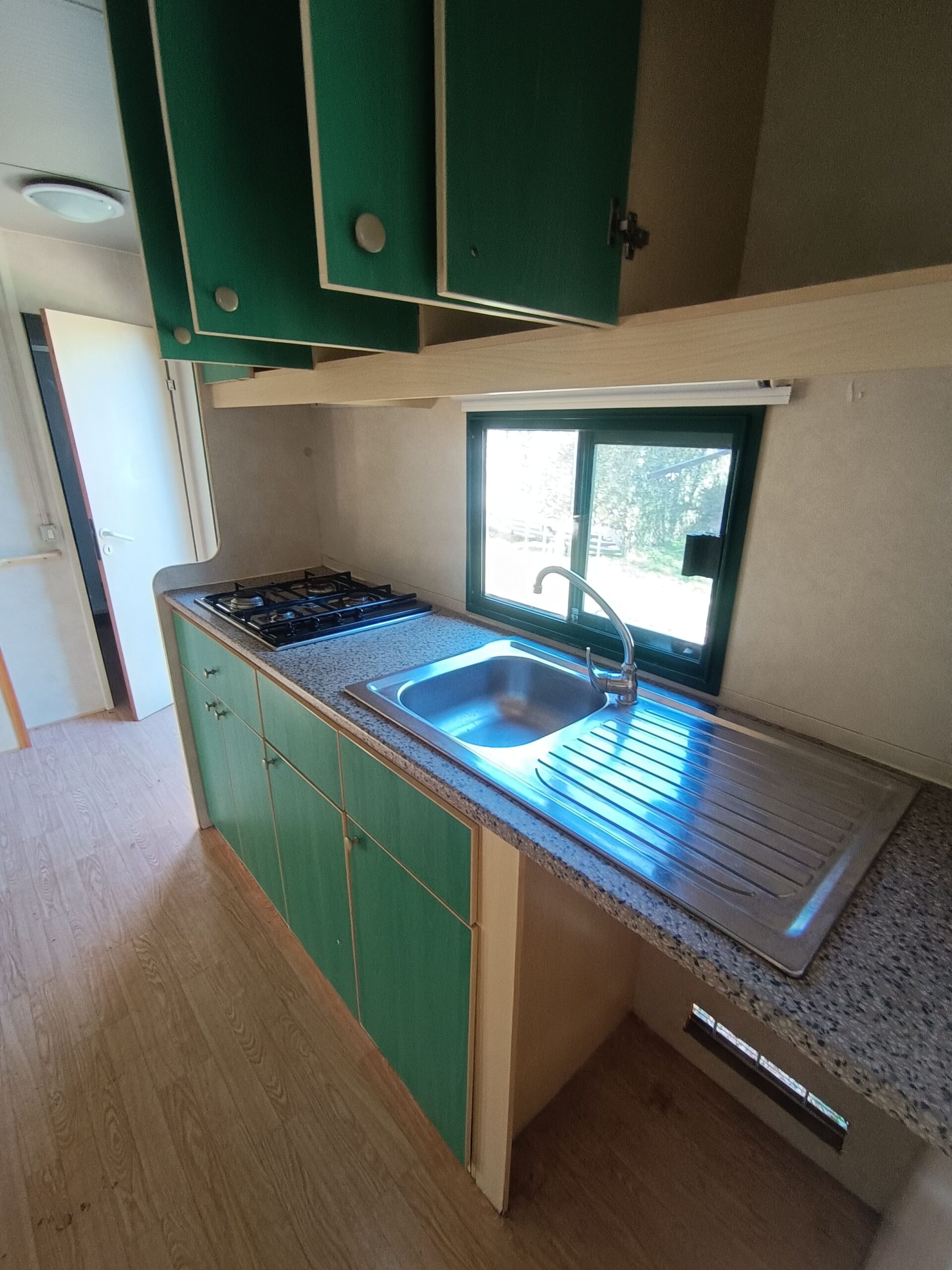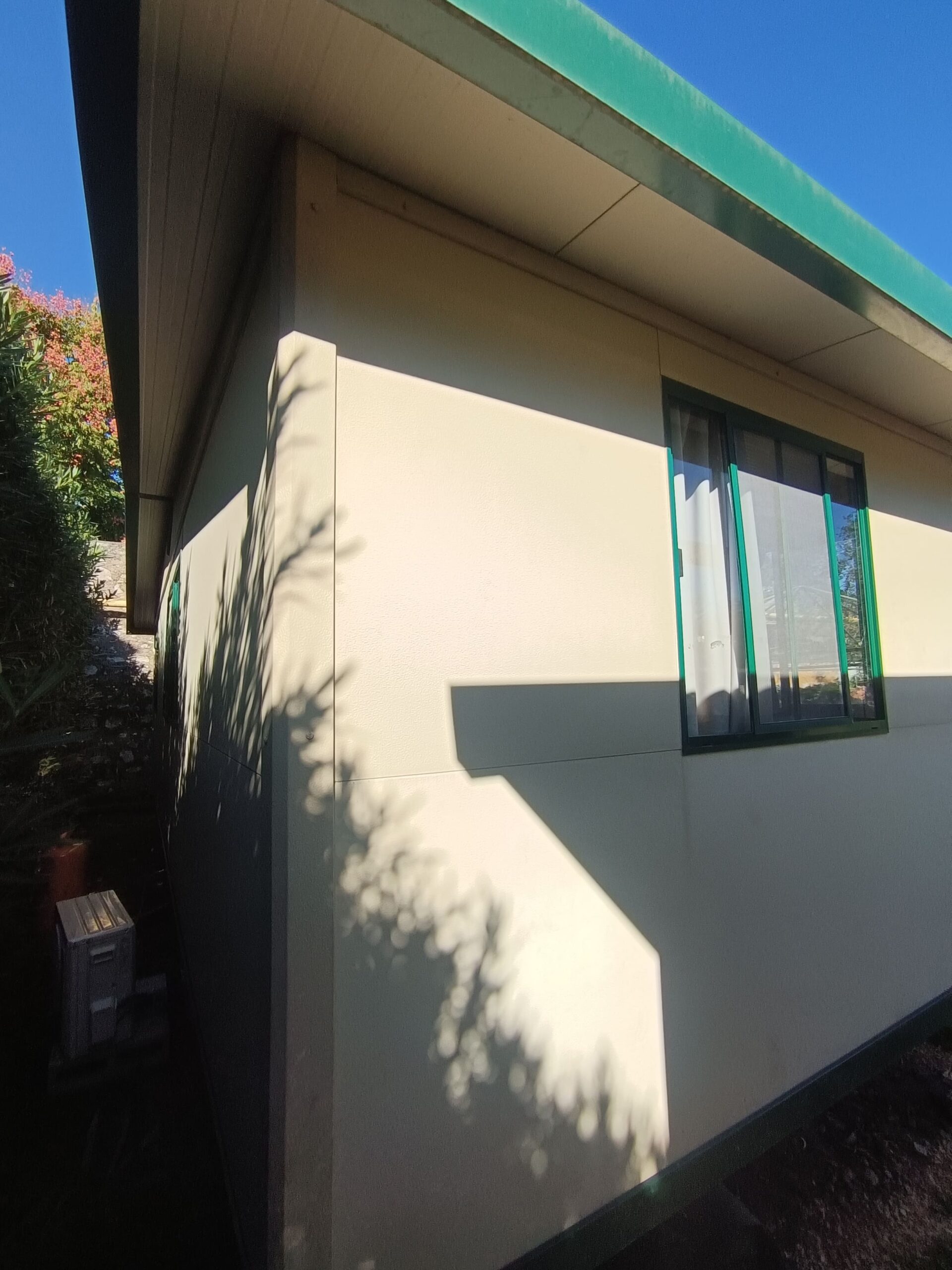Pannellatura perimetrale XPS. Tetto con lamiere grecate (ottimo carico neve). Carrello su ruote in acciaio zincato con cosciali, barre perimetrali, omeghe (barre trasversali), assale con ruote. Infissi in alluminio con vetro 18mm