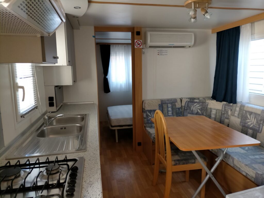 La casa dispone di una composizione interna ben studiata, che offre ampi spazi e funzionalità per tutta la famiglia. La zona giorno è composta da un soggiorno con cucina e dinette, perfetto per condividere momenti di relax e convivialità. La zona notte, invece, vanta una cameretta con 3 posti letto (uno a ponte, ideale per bambini fino a 8 anni) e una camera matrimoniale. Il bagno completo di wc, lavandino e doccia garantisce comfort e praticità.